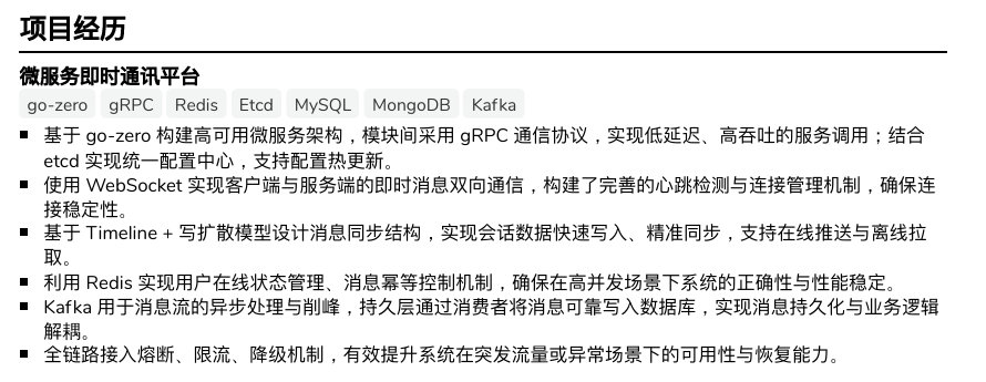 这里就有 etcd、websocket、连接管理、写扩散、redis、kafka、熔断限流降级等多个点可以与面试官讨论,不至于一看就毫无亮点。