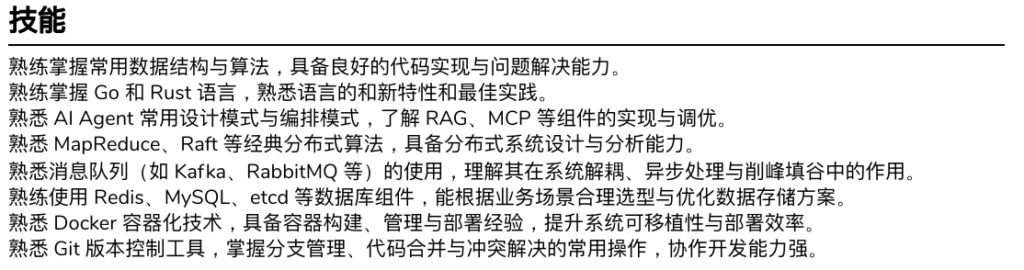 简历除了教育信息、奖项、项目经历、实习经历、专业技能以外,不宜添加其他内容。专业技能可以这样编写: